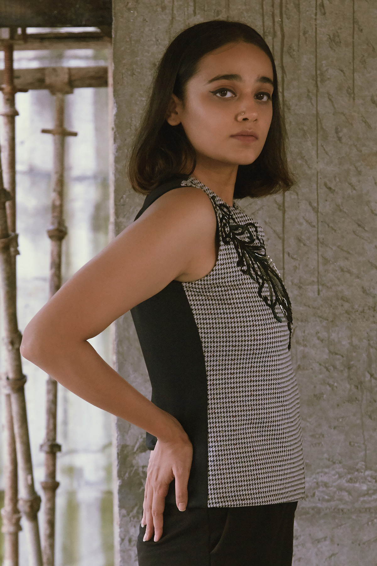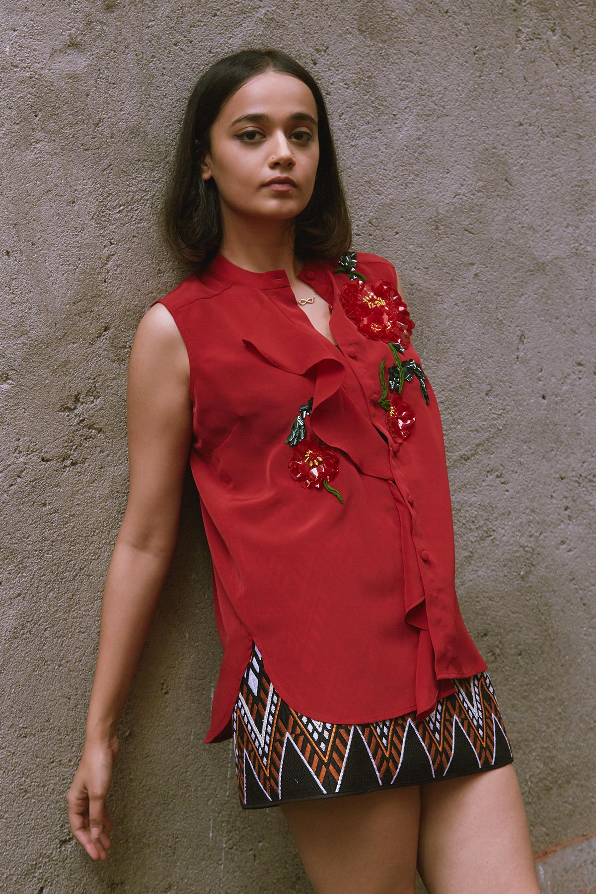 DESCRIPTIONThis splendid red and blue checkered vest has a straight silhouette and is embellished with handcrafted sequins applique design.