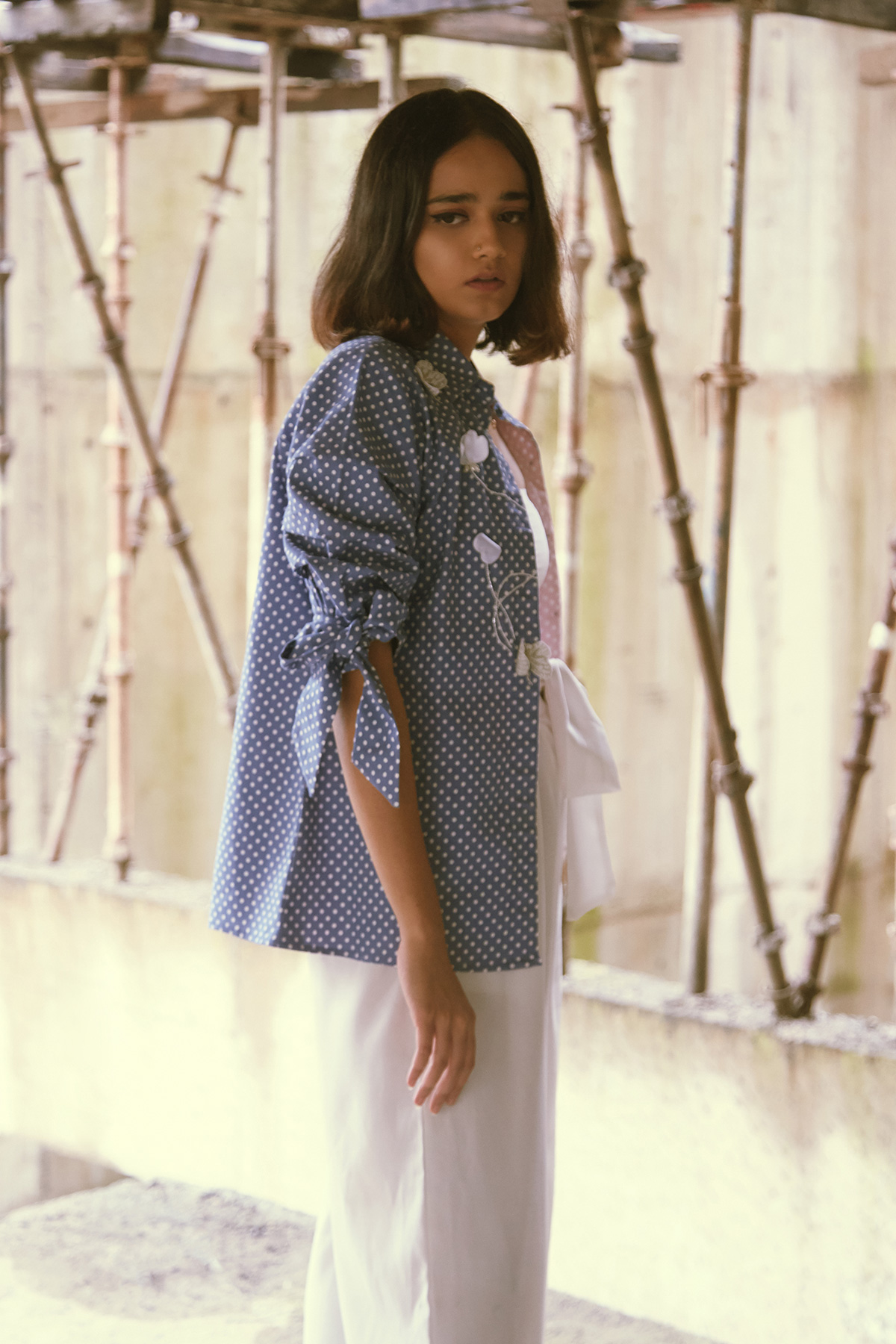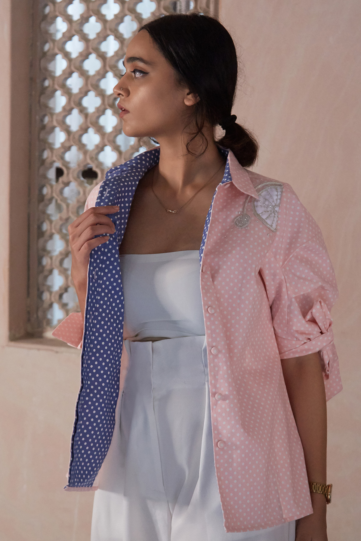DESCRIPTIONCute, great personality and good taste in fashion? You’re a catch. And so is this pleated bow sleeved shacket from our collection, with its polka dot print and handcrafted tricycle embroidery.