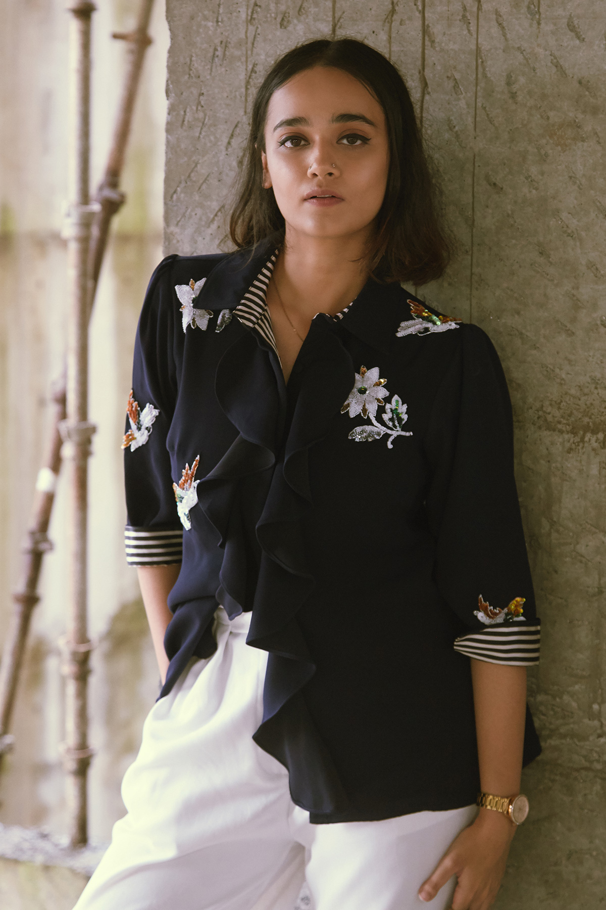 DESCRIPTIONNavy blue crepe blend ruffled shirt-jacket from our collection featuring an embroidered handcrafted sequin design , classic collar, stripe flap and puff-sleeves.