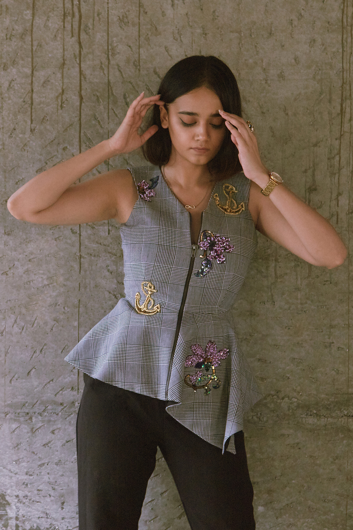 DESCRIPTIONThis beautiful feminine checkered jacket from our collection is hancrafted with multicolor sequins and thread work. The style is cut with a body hugging bodice that falls to a slightly asymmetrical peplum hem.