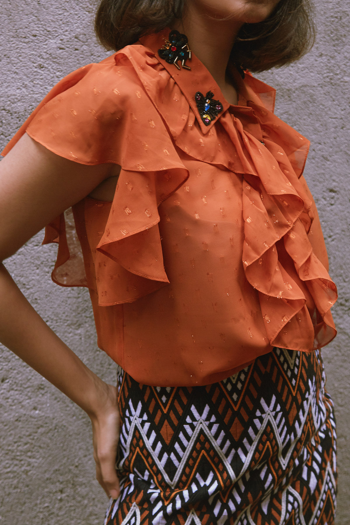 DESCRIPTIONCreate a strong silhouette with this chiffon shirt with gold lurex jacquard cut. The sleeves and chest are framed with a bold ruffled trim, classic collar with hancrafted applique embroidery and a concealed button down front.