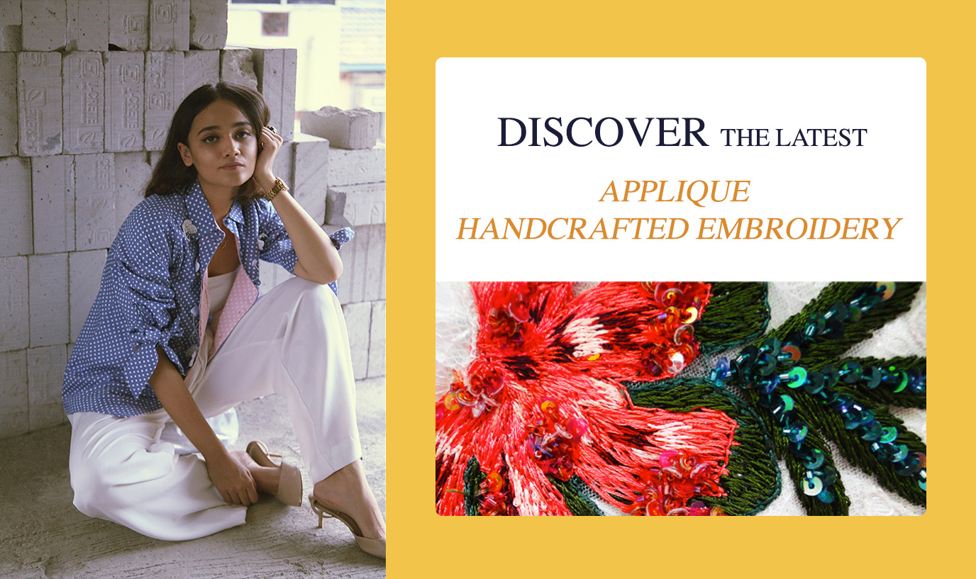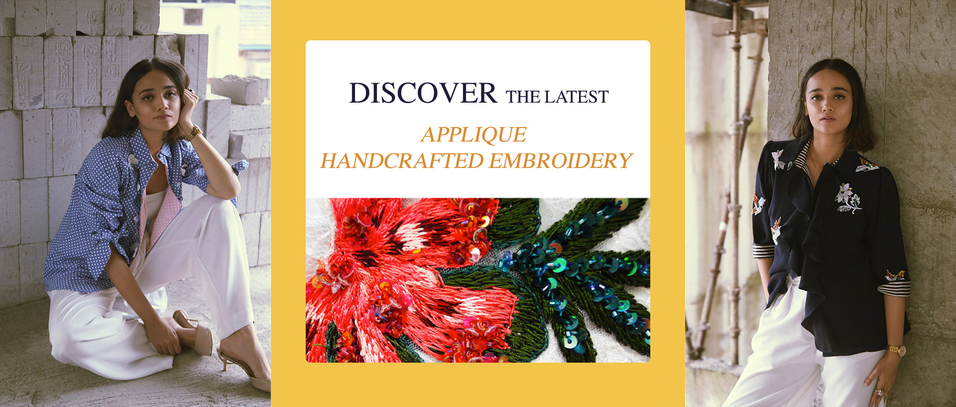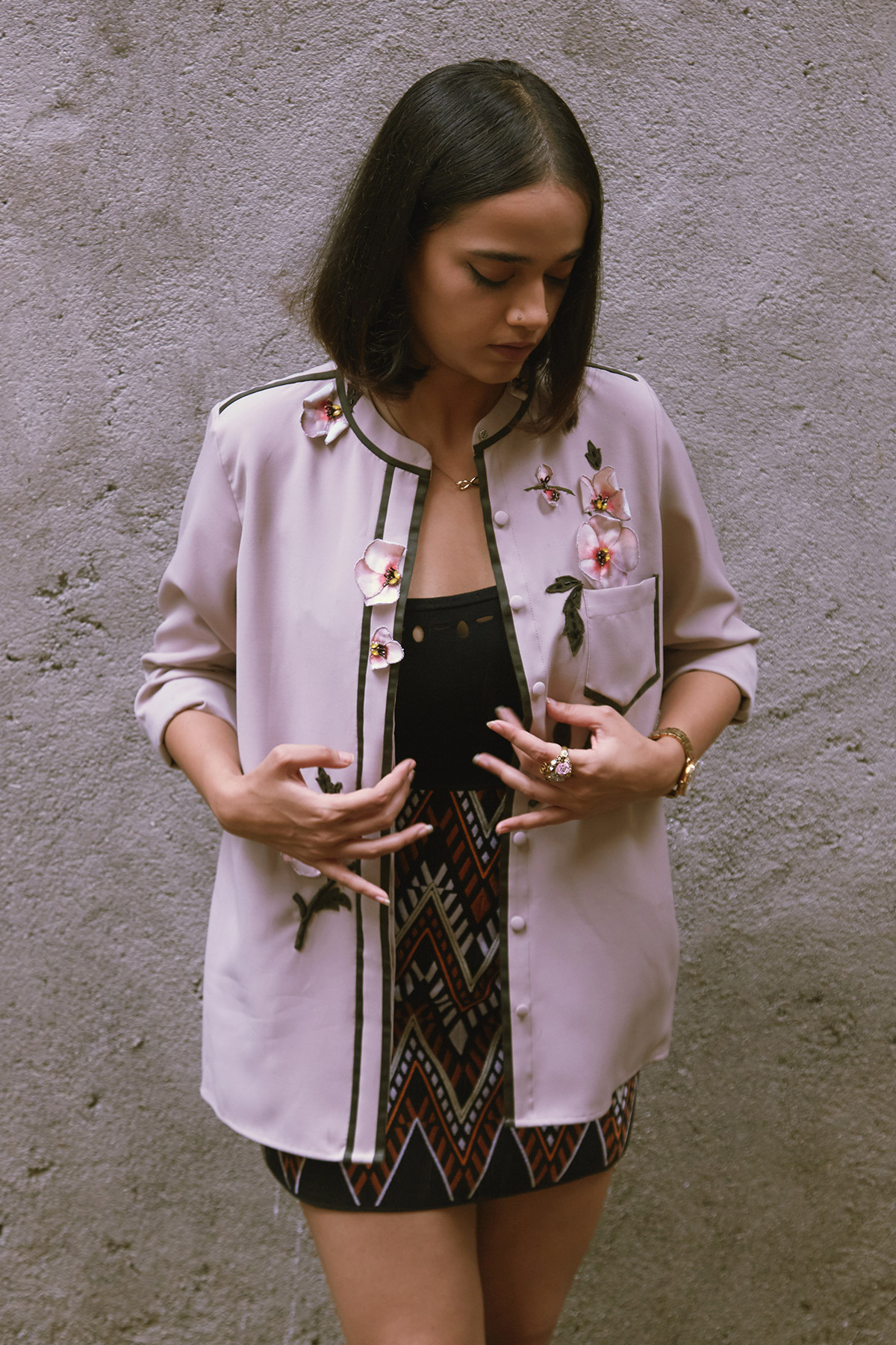DESCRIPTIONThis classic mandarin beige jacket-shirt from our collection is the kind of piece on which modern wardrobe foundations are built. Handcrafted with floral applique embroidery, its designed for a relaxed fit with full sleeves and a long-line hem.