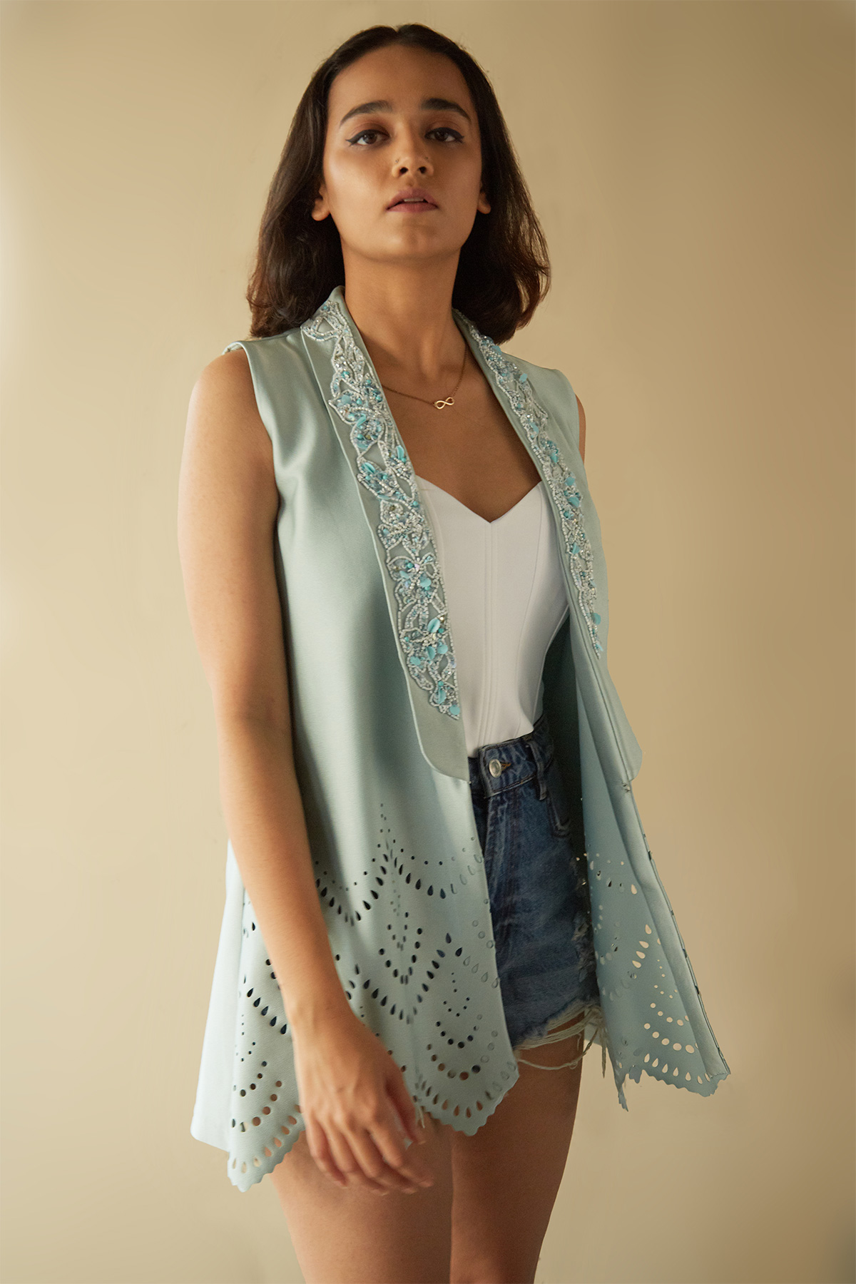 DESCRIPTIONAcquire a distinctive silhouette for your formal edit in the form of this mint green vest from our collection handcrafted with same tone sequins and open front fastening.