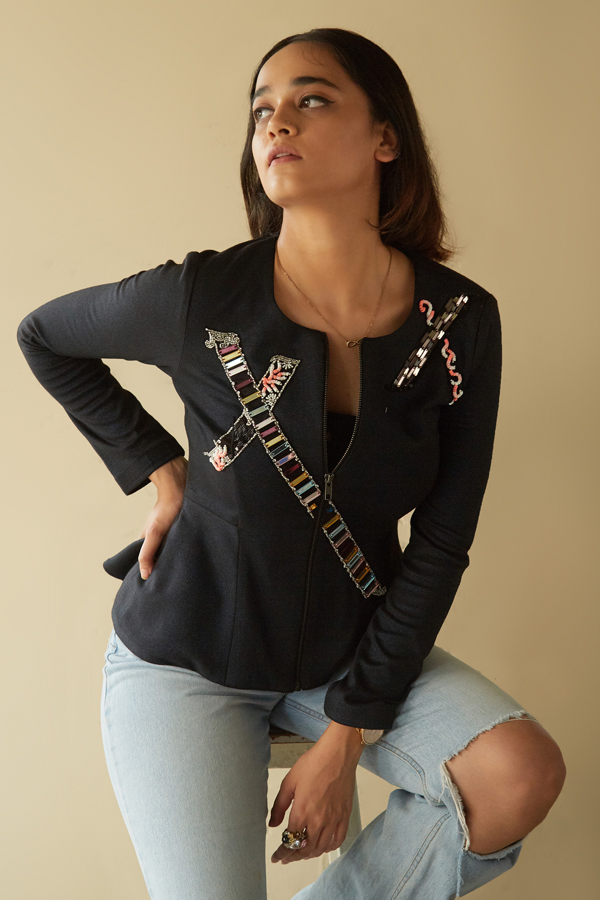 DESCRIPTIONThis two tone peplum jacket with handcrafted glass embroidery is the piece you need to bring music into your life.