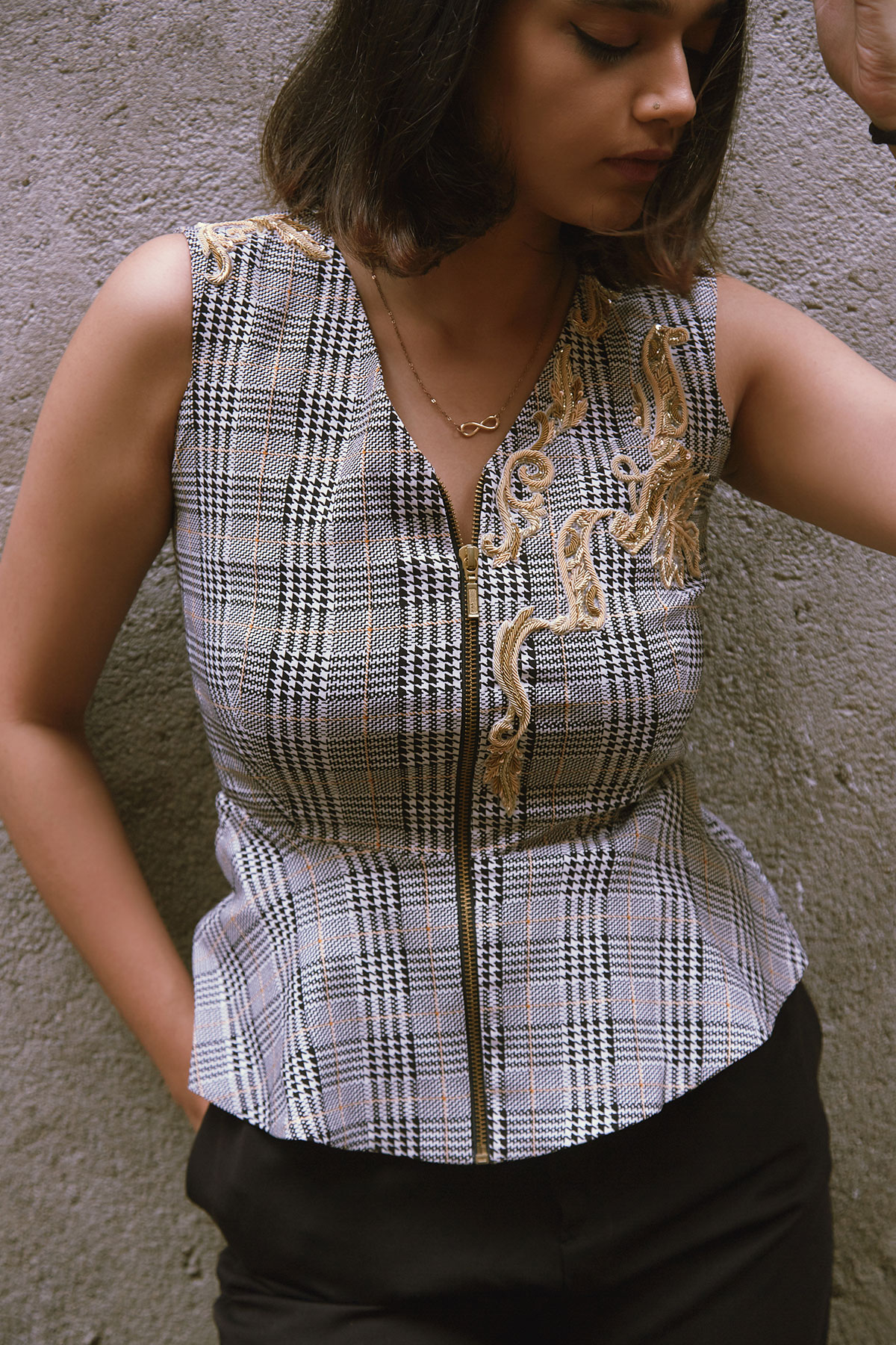 DESCRIPTIONGold-blend houndstooth peplum jacket from our collection featuring a v-neck, ribbon handcrafted embroidery, a sleeveless design, a fitted silhouette, a scalloped hem and a rear zip fastening.