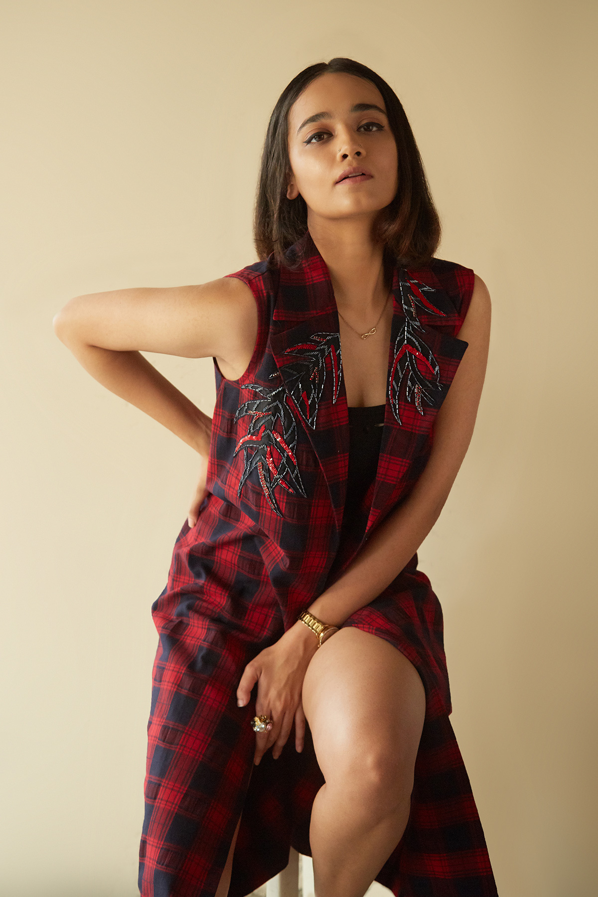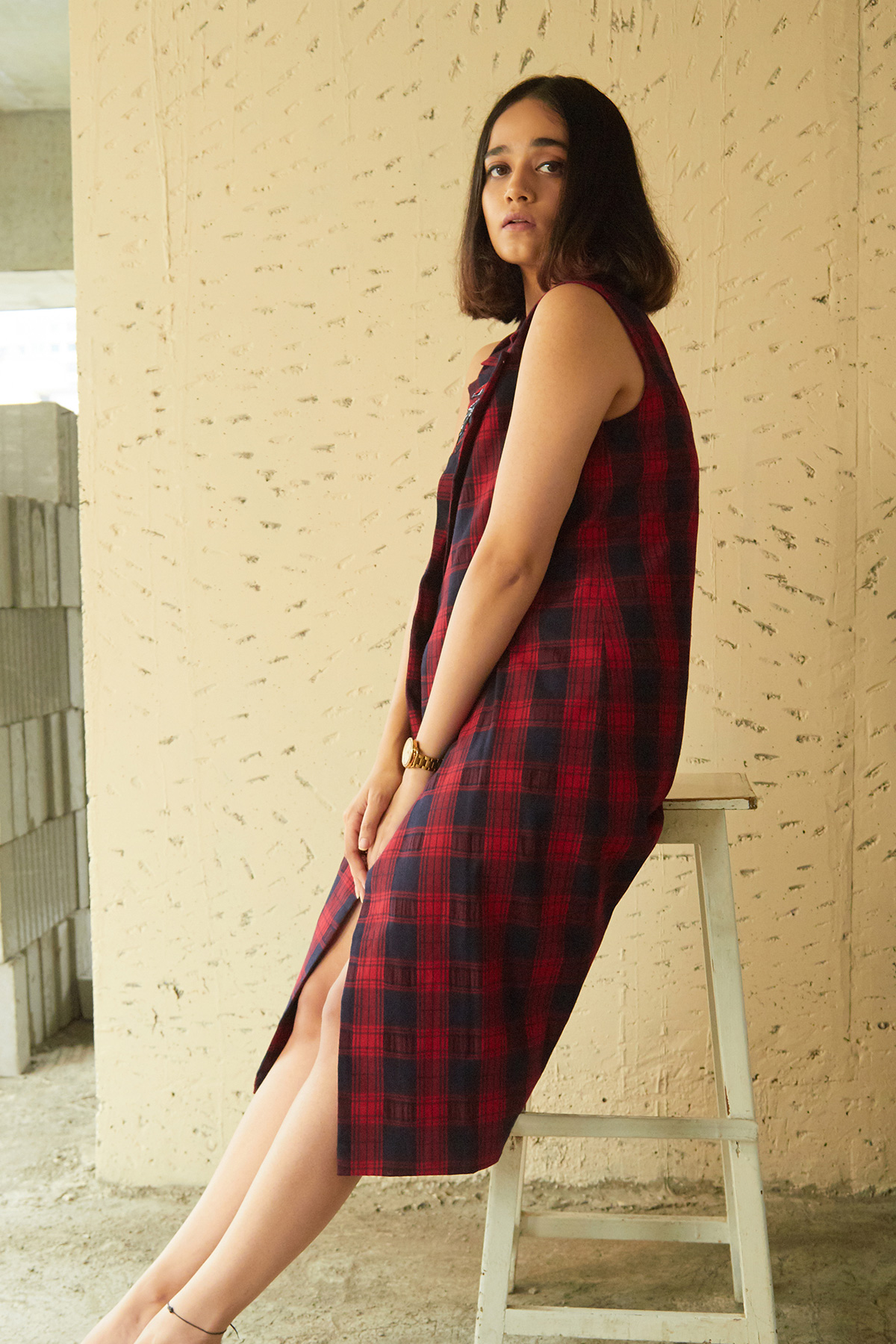 This splendid red and blue checkered vest has a straight silhouette and is embellished with handcrafted sequins applique design.