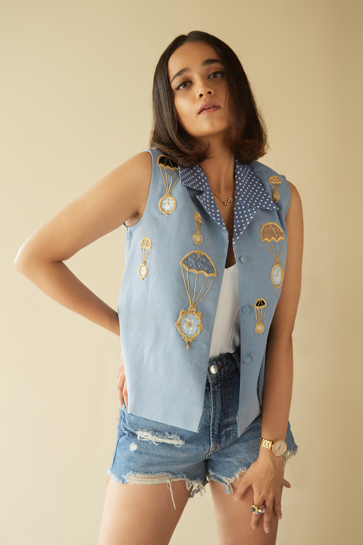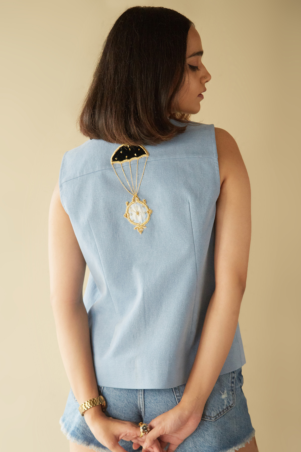 This parachute clock denim vest is so charming, it’s the type of piece you'll grow attached to. From the embellished golden chains to multicolor applique design, every little detail has been carefully considered.