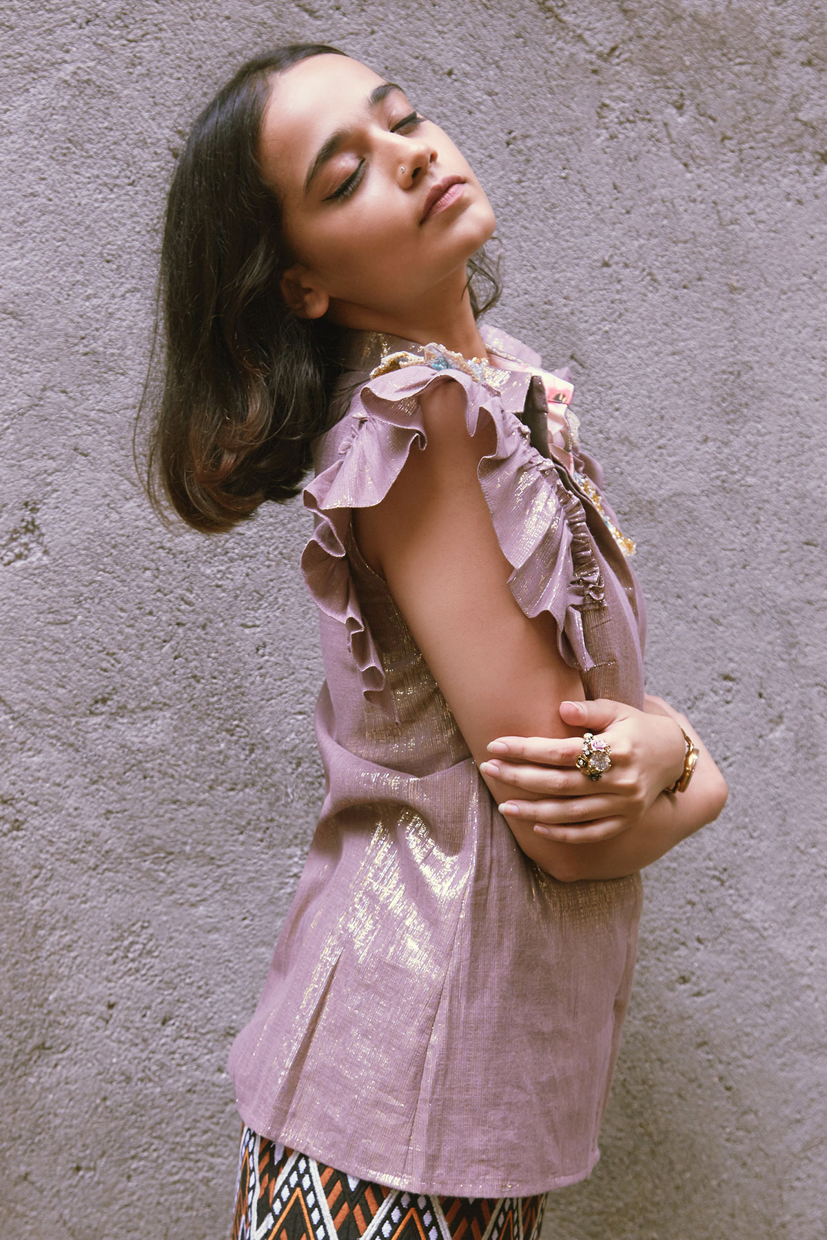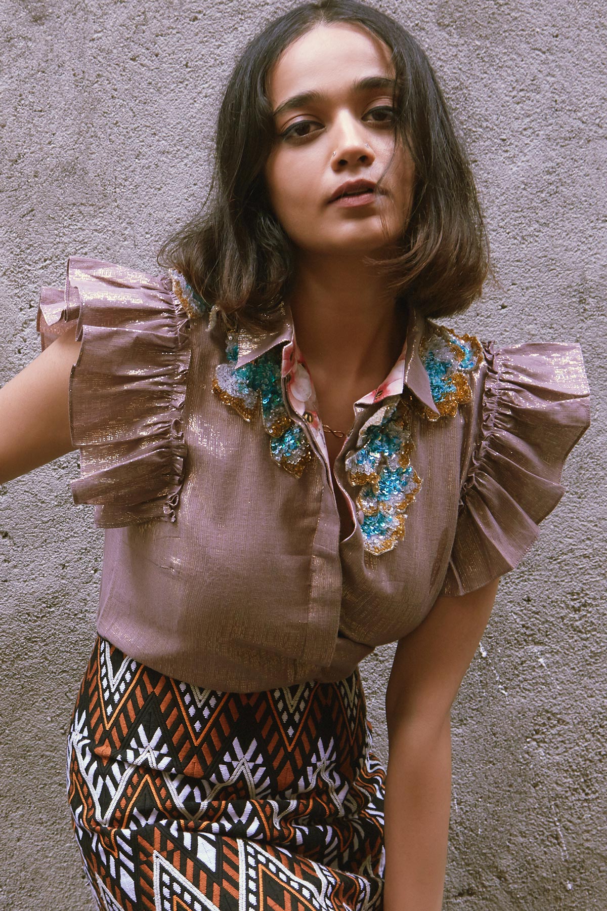 Purple-tone metallic voile shirt from our collection featuring a gold sheen, a classic collar, frill sleeves and 3d sequin applique embroidery.