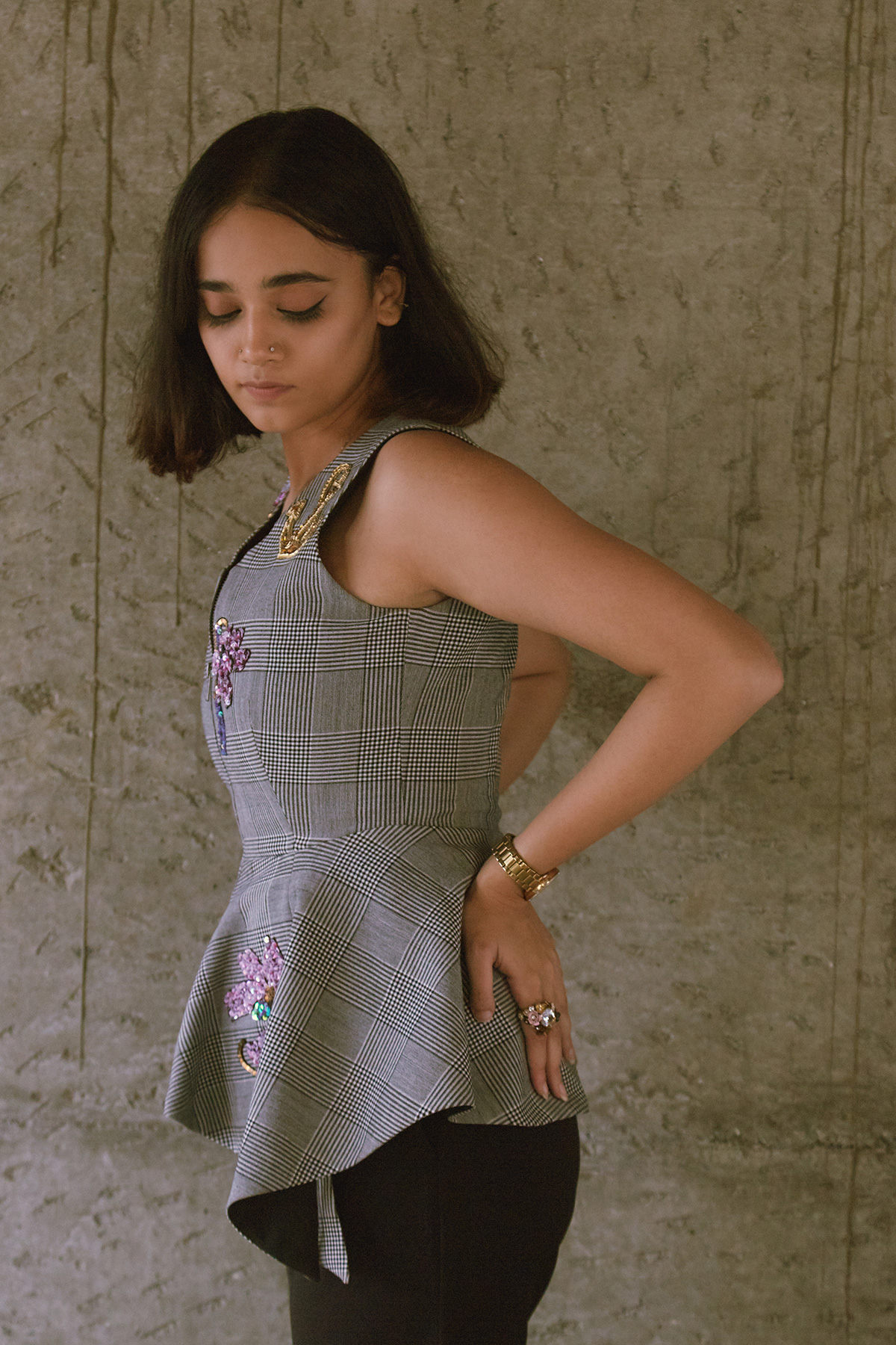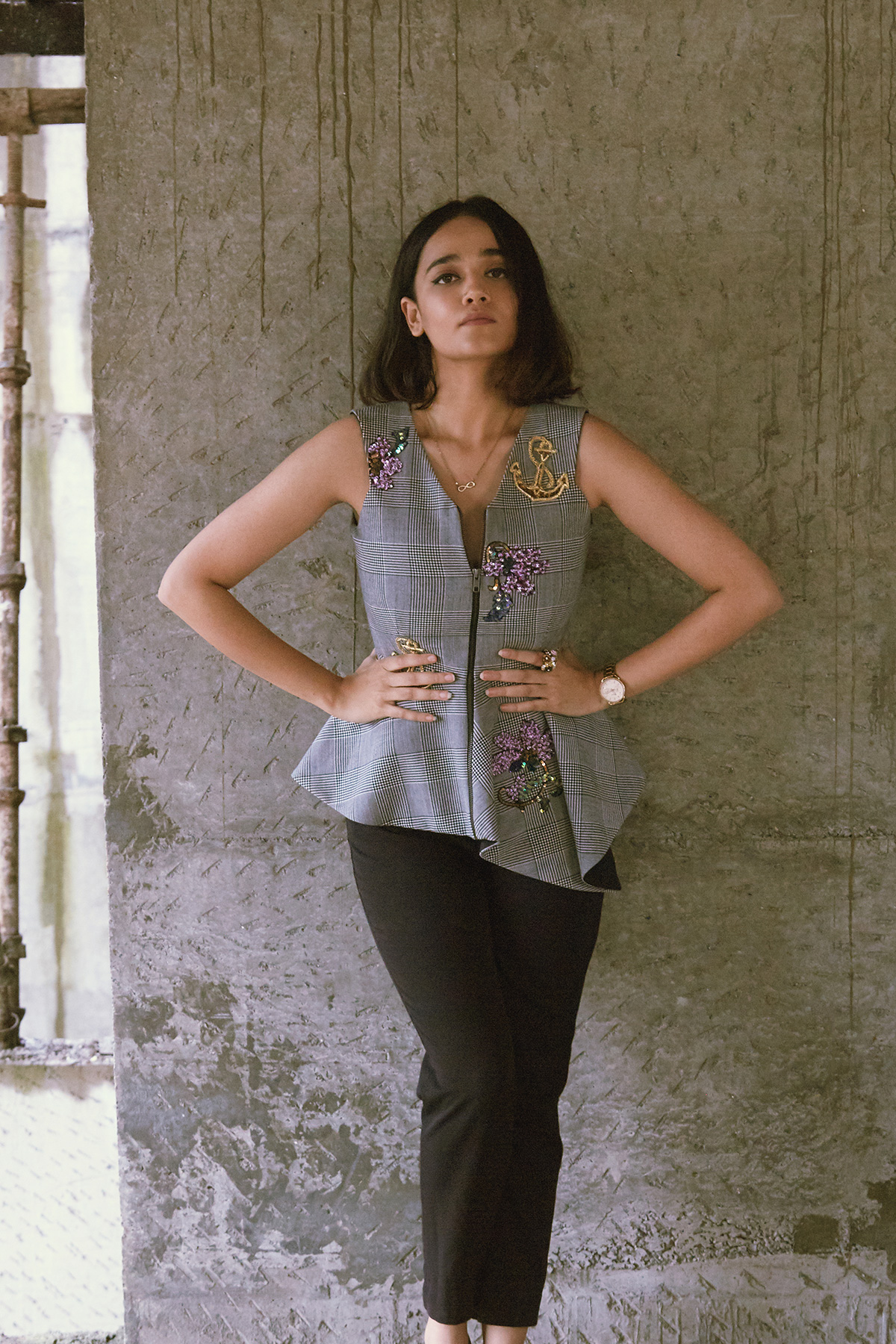 This beautiful feminine checkered jacket from our collection is hancrafted with multicolor sequins and thread work. The style is cut with a body hugging bodice that falls to a slightly asymmetrical peplum hem.