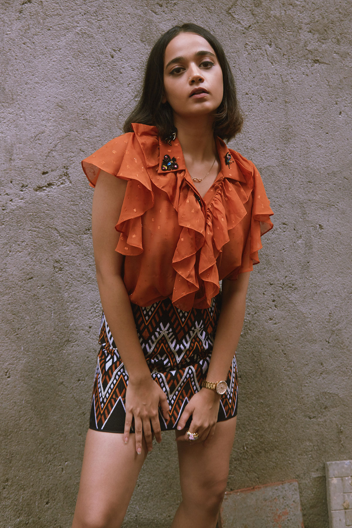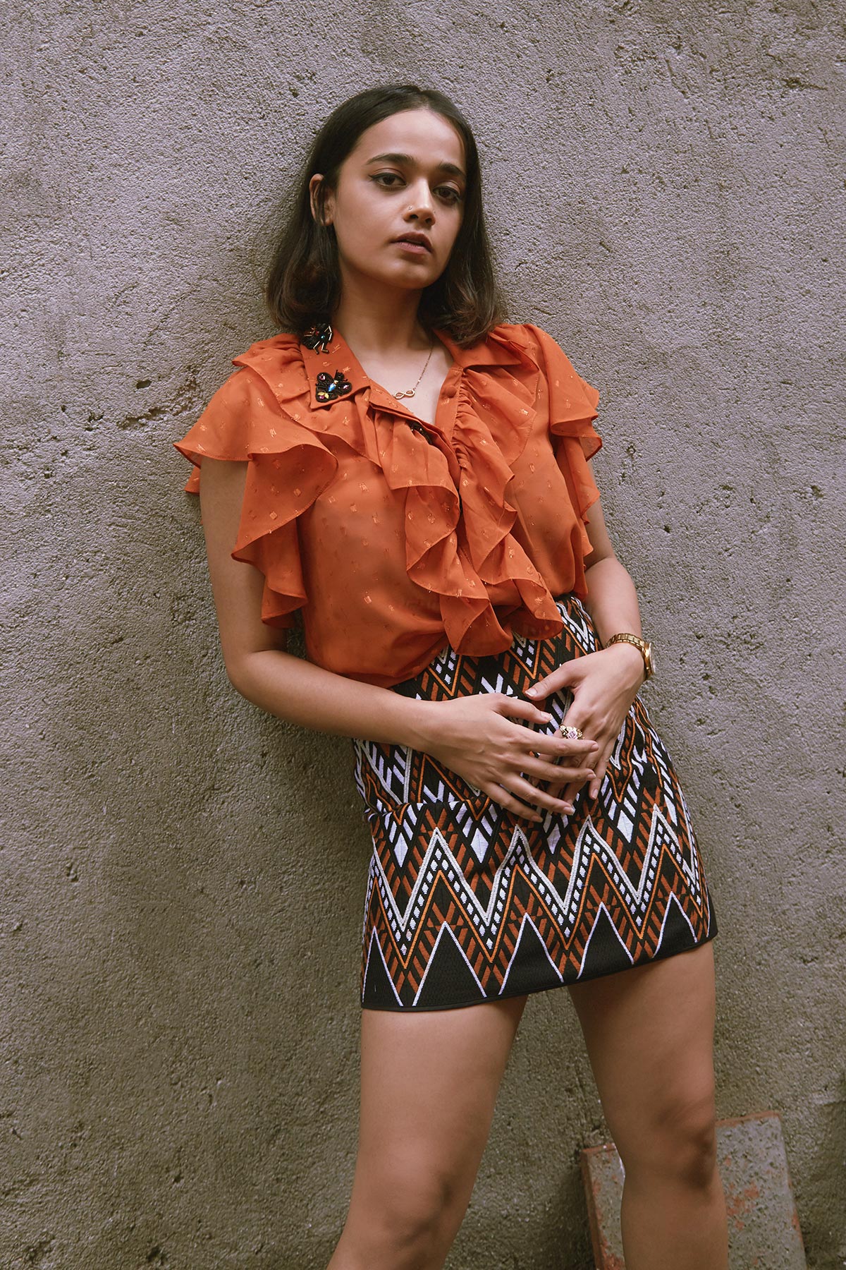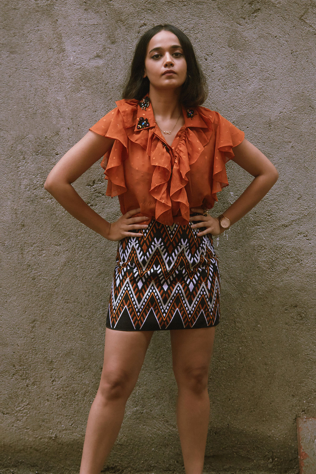 Create a strong silhouette with this chiffon shirt with gold lurex jacquard cut. The sleeves and chest are framed with a bold ruffled trim, classic collar with hancrafted applique embroidery and a concealed button down front.